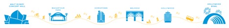 There will be six major hubs along the route featuring performance stages, art installations, food trucks, screen-printing, kid-friendly activities, dancing, and live music from LA’s best musicians: Walt Disney Concert Hall (Grand Avenue between 1st Street and 3rd Street), MacArthur Park (Park View Street between Wilshire Boulevard and 6th Street), Koreatown (Liberty Park – Wilshire Boulevard between Serrano Avenue and Oxford Avenue), Melrose (Melrose Avenue at Windsor Boulevard), Hollywood (Vine Street between Hollywood Boulevard and Yucca Street), and the Hollywood Bowl (Kagan Patio).