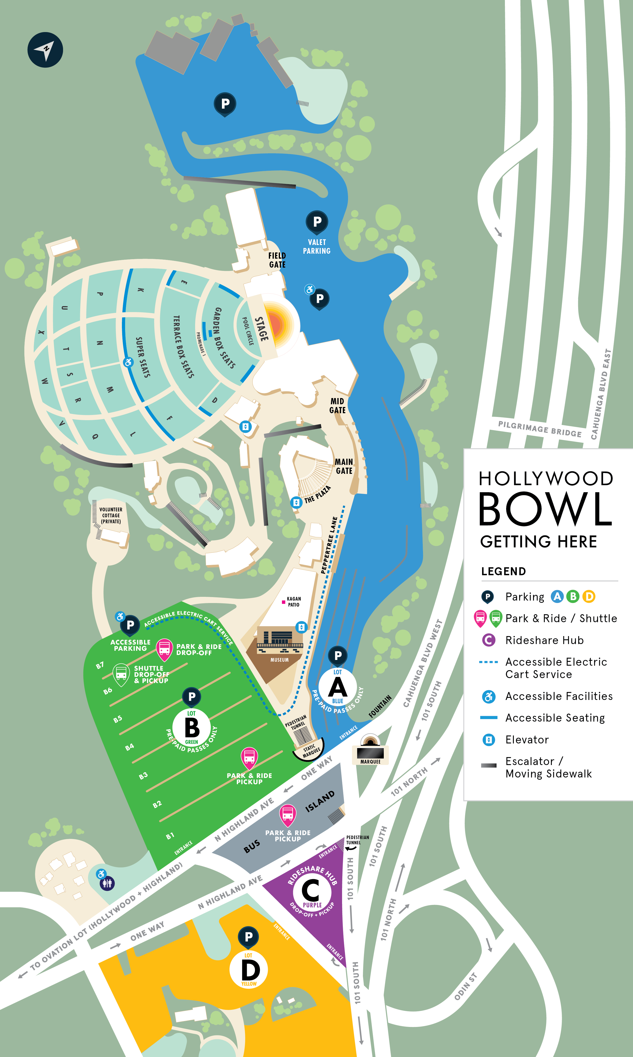 Rideshare drop-off and pick-up at the Bowl are located in Lot C (Purple).